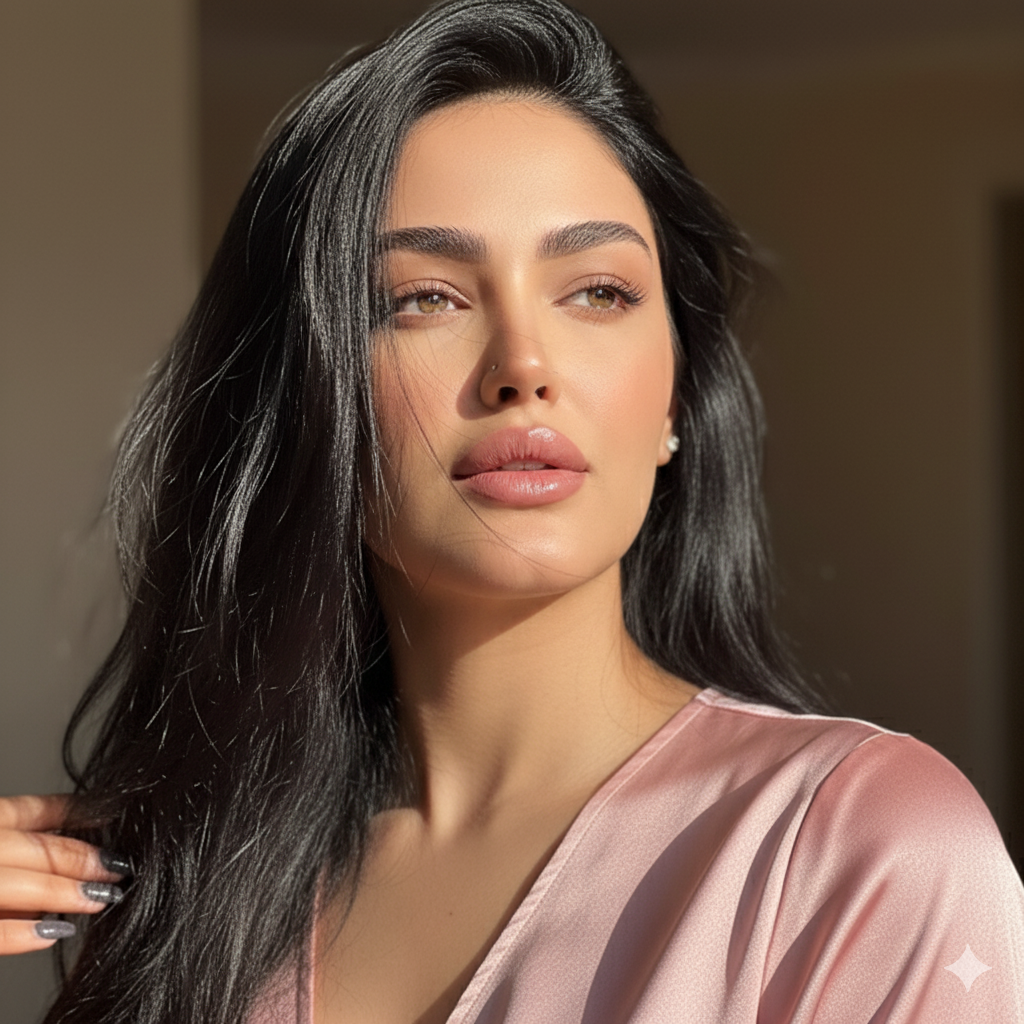 ‎Hyper-realistic cinematic Create an 8k photorealistic image using the attached photo. A close-up portrait of a woman with long, jet-black, slightly wind-swept hair falling across her face. Her striking, light-colored eyes gaze upwards and to the right, catching a sharp, diagonal beam of natural light that illuminates the high points of her cheekbone, nose, and plump, glossy, mauve-toned lips a slightly light weight silk
